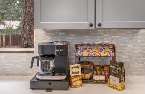 Towering pines and the smell of mountain air, with a cup of coffee provided by our coffee bar? Yes please! One of the highlights of your stay with us will be the backyard experience. Soak in the hot tub while enjoying stunning Northern Arizona sunsets, make s'mores with your family and friends at the fire-table, and play some corn-hole!