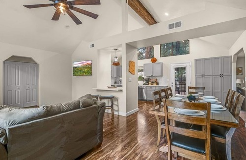 NEWLY REMODELED Mountain Retreat – Minutes to NAU & Downtown Flagstaff! Welcome to your perfect Flagstaff getaway! Enjoy the gorgeous fall colors of Northern Arizona at Flagstaff Fireside! This beautifully updated home blends rustic charm with modern convenience, ideal for mountain vacationing. Roomy split‑floor plan with two living areas and two full bathrooms gives guests plenty of room. Two separate lounge zones, one cozy by the indoor gas fireplace, the other ideal for large gatherings. Ponderosa pine views, fire-pit vibes, and a large, fenced yard. With A/C!