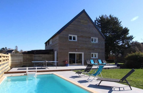 House 2 "Cap Zindian": Large dining room. Fully equipped kitchen. Living room (TV, internet). Shower room with toilet. Upstairs, bedroom 1 (two twin beds (90x200cm) and a 90x190cm bed), bedroom 2 (two twin beds (90x200cm) and a 90x190cm bed), bedroom 3 (king-size bed and two bunk beds (90x190cm), bathroom with shower and double sinks. Wc. Electric heating. Laundry room (washing machine). All charges included. Baby equipment on request. Sheets and towels provided. Beds made on arrival. Cleaning service included. Private enclosed garden. Terrace (awning). Garden furniture. 2 gas planchas. Spa and private swimming pool (7.5x3.5m) heated from June to September. Deckchairs. Ping-pong. Volleyball net. Private enclosed parking. In the peaceful hamlet of Groussey, this vast property, entirely enclosed by walls and fences, is a green setting perfect for recharging your batteries in large numbers. A first house with thick stone walls, has 4 bedrooms upstairs. The second, warm as can be with its painted wood and large bay windows, is XXL format to comfortably accommodate the whole tribe! With 3 large living rooms open to each other, it encourages living together! Close to the seaside resort of Jullouville and its large sandy beach, you can discover the treasures of Mont Saint-Michel Bay and, perhaps, the D-Day landing beaches, 100 km away. Eric and Valérie will hand you the keys to this paradise. They live in the village and will be happy to guide you through this beautiful area. The owners will be vigilant about any excessive noise pollution in this peaceful hamlet.