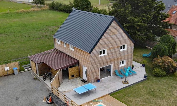 House 1 "La Planche": Living room with pellet stove (TV, internet, bar foosball table). Dining room. Fully equipped kitchen. Shower room with toilet. Upstairs, bedroom 1 (queen-size bed), bedroom 2 (queen-size bed), bedroom 3 (queen-size bed), dressing room between bedrooms 2 and 3, bathroom with toilet. Electric heating + pellet stove.