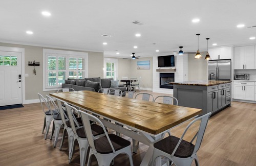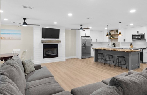 Step inside to a bright and inviting space, where soft pastel blue walls create a serene coastal feel. The living room is the perfect spot to gather, featuring a comfortable sofa, a TV for entertainment, and a fireplace to cozy up to on cooler evenings. The fully equipped kitchen makes meal prep effortless, complete with a Keurig for your morning brew, a blender for beachside smoothies, and a refrigerator with an ice maker to keep drinks chilled. Share a meal at the dining table for ten, grab a quick bite at the breakfast bar, or settle into the eat-in kitchen nook for a laid-back start to your day.