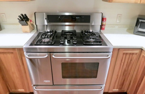 The kitchen is fully equipped and features a gas range fit for a chef! The laundry room is just off the kitchen.