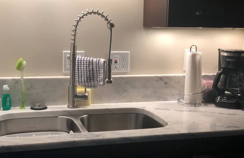 Our Seaview Romance Suite is newly constructed with 10' ceilings, LED lighted upper coves and all new luxury furnishings. The very spacious Studio area serves as a combined Great Room with Sofa (and second bed for 2), dining area, as well as dining chair seating. Enjoy the flat screen TV with Direct-TV access, plus a desk and free wi-fi throughout property. Rest in a delightfully comfortable Purple® King Bed with My Pillows® (washed after each guest stay) in the Great Room. The Kitchenette offers a fridge, convection oven, microwave, toaster & coffeemaker. The gorgeous bath with marble throughout includes a heated micro-bubble Tub, long floating vanity with two sinks, color LED accent lights below and also around the mirror above. And the huge walk-in glass enclosed shower has 2 shower heads on opposite walls and large shower head on the ceiling. Our Seaview Romance Suite can comfortably sleep up to 4 people with use of the California King bed and the full size sofa bed.