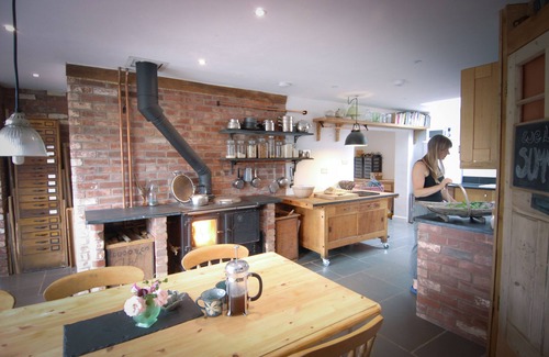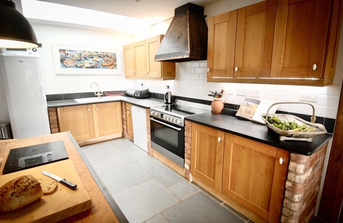 Open plan kitchen off the living area, with large kitchen island, double range oven and hob, larder size fridge, microwave, toaster, kettle and pretty much everything else you could possibly need in a kitchen (this is often our home, so it is well equipped)