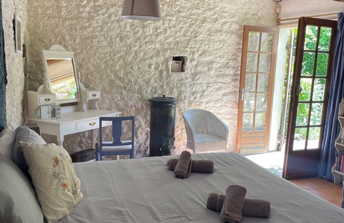 Rustic & relaxed this is a charming, and very spacious house full of French character. Natural stone walls, ancient oak beams, a great pool and large terrace for al fresco dining in the Dordogne area, near Bergerac, make this the perfect, chilled holiday house. It sleeps 10 in 5 very spacious bedrooms. You get the whole house in a quiet hamlet with beautiful walks through the vines and local woodlands. A great and well kitted out kitchen, dining room & separate sitting room with log burner for the winter, make this holiday home ideal for larger groups. Located in a peaceful hamlet yet 5 mins from a busy market town, with chateaux, golf, kayaking, paddle boarding and go karting all on your door step.