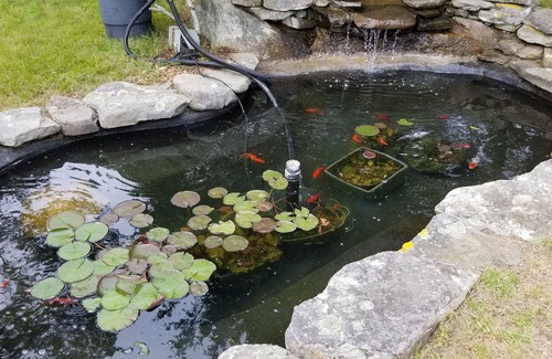 The koi pond with waterfall adds a nice ambiance to the back yard and gives a soothing sound when outside. Kids and adults love to watch the goldfish!