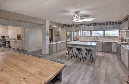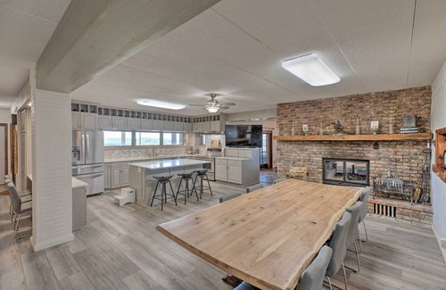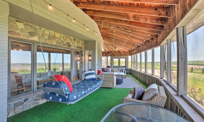 Escape to the rolling hills of South Dakota at this 4-bedroom, 4-bathroom home. This poured concrete, earth-sheltered Wagner vacation rental offers panoramic views of the Missouri River and private water access to boot. Put the beach towels in the golf cart for a beach day, lounge on the huge screened porch, or play ping pong in the game room. Get separation in the ‘hunter’s lodge’—a studio space with a second kitchen—or find family togetherness streaming a movie on one of 3 65-inch Smart TVs.