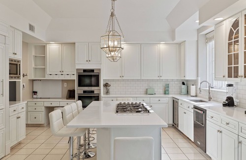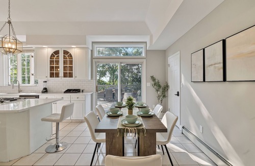 When you’re not out dining at the Hudson Valley’s farm-to-table restaurants, you’ll love the spacious dream kitchen with its beautiful design of white cabinetry, white countertops, and subway tile. Prepare meals on expansive countertops while your friends and family gather at the huge kitchen island with seating for six. An additional six people can sit at the eat-in kitchen table while enjoying nature views through sliding glass doors to the deck. For even more seating, the spacious formal dining room hosts a 12-person dining table. Stainless steel appliances, a gas range, double ovens, a wine fridge, a Keurig coffee maker, multiple small appliances, and plenty of dishware and cutlery all make meals on your getaway easy.