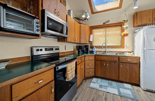 The fully equipped kitchen comes with all the standard amenities for cooking during your stay. Dine indoors at the large table or head outside for alfresco dining with riverfront views.