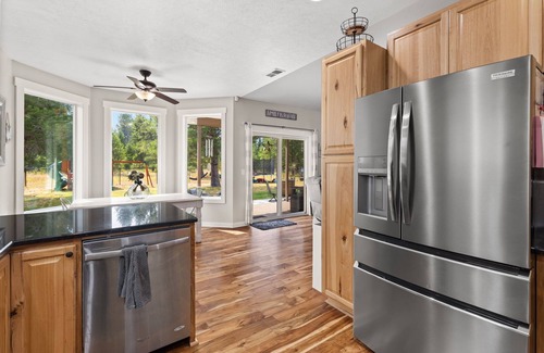 Your stay at this remarkable property offers a wealth of amenities designed for relaxation and entertainment. Unwind in the soothing hot tub or jetted tub after a day filled with adventure, or gather around the fire pit for cozy evenings under the stars. Families will adore the outdoor offerings, including a horse-friendly fenced area, zipline tire swing, trampoline, and kids' playset. Inside, enjoy the spacious living room, fully-equipped kitchen, and four comfortable bedrooms, ensuring that every guest has a restful place to recharge.