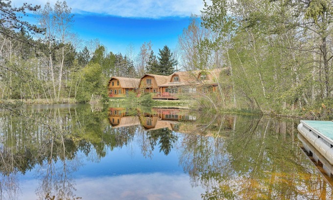 Surrounded by towering trees on 26 private acres, this Sterling vacation rental has all the perks of an amenity-filled resort with the peace of a secluded escape. This 4-bed, 3-bath cabin features a sunroom with a dedicated bar area, a fully equipped game room, and an indoor pool and hot tub. Plus, you'll have on-site access to a large private swimming pond, a waterfront gazebo, and a cozy fire pit! Nearby you’ll find charter fishing in Saginaw Bay, snowmobile and ATV trails, and 5 golf courses.