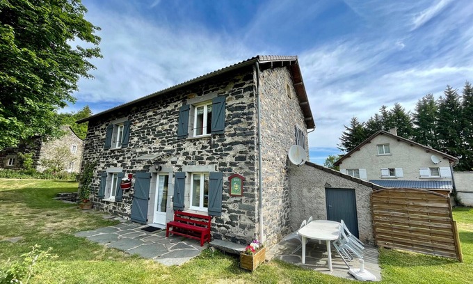 Located in a wooded environment, on the edge of the Meygal forest, this cottage is a large independent stone house with 2 pleasant terraces (8 and 9 m²) and a private unfenced lawned area of 200 m² with children's games.