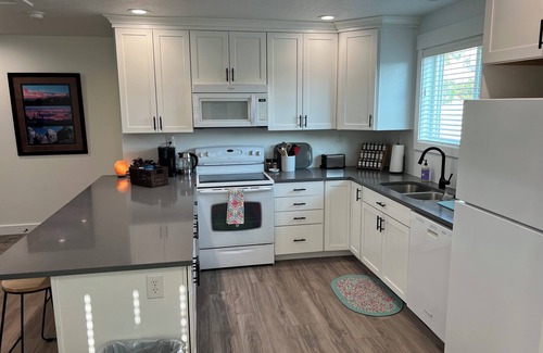 Escape to this well-equipped, spacious studio apartment in a quiet, North Logan neighborhood, less than a mile from USU campus. This space offers all the essentials for a comfortable stay including a new Queen-sized bed, a full kitchen, living area with a large recliner leather couch and TV / WiFi for some evening movies. A full-sized desk is available for those looking to work remotely with 2nd-floor views of grassy open spaces, mountains to the East, and valley sunsets to the West.