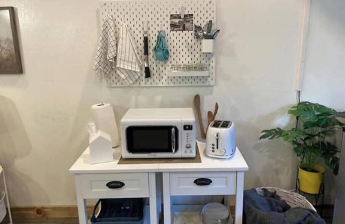 The 1 bedroom 1 bathroom suite is spacious, airy and a true retreat with its own private entrance. Note, the suite is completely locked off and private but it does reside within a larger home with some noise transfer from the main house (we provide a white noise machine). At ~350 sq ft. the suite is spacious enough to include an en-suite bathroom with a huge walk-in shower with dual shower heads, separate workspace / seating area, wardrobe, dining table, mini-fridge and microwave.