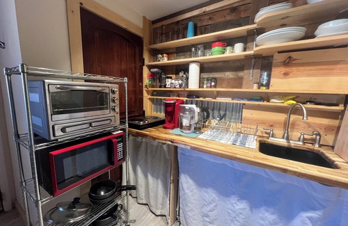 Kitchenette - loaded with appliances (small fridge under counter, large fridge nearby).
