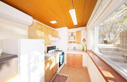 Discover the charm of this large studio, a cozy and well-appointed space that comfortably sleeps two. With easy access to Santa Fe’s top attractions, this retreat blends style, comfort, and convenience, making it ideal for a relaxing getaway or a work-friendly escape. King-size bed with quality cotton linens ensures restful nights. Bathroom with a combination tub and shower for added convenience. Brick floors and a large skylight create a warm, sunlit ambiance. The kitchenette is fully equipped with a refrigerator/freezer, a four-burner gas stove with an oven, and a microwave. It also includes all the essentials for meal preparation, such as a coffee maker, grinder, toaster, and more—making it a convenient and well-stocked space for cooking during your stay. Dining table for two, perfect for meals or casual conversations. Two comfortable chairs and a small desk offer a cozy spot for unwinding or catching up on work. Bonus sunroom with two chairs, footstools, and a desk—an ideal setting for reading, working, or an afternoon nap. Wi-Fi, satellite TV (Dish Network), and a DVD player for entertainment. Ductless heating and air-conditioning keep the studio comfortable year-round. Located close to grocery stores and shopping, this studio offers the perfect blend of tranquility and accessibility, ensuring a seamless Santa Fe experience.
