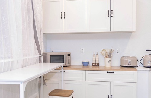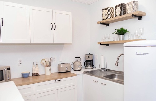 Welcome to your stylish and comfortable open-concept studio, where modern convenience meets charming retro flair. This thoughtfully designed space features a fully stocked kitchen, complete with a collection of vintage-inspired kitchen gadgets that add a touch of nostalgia while providing everything you need to cook and entertain. Enjoy your meals at the sleek bar table with cozy bar stools, perfect for casual dining or morning coffee.