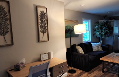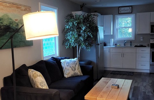 This modern farmhouse style studio home is the perfect place to relax and unwind when traveling or just visiting with friends and family. Beautiful finishes in kitchen and large bathroom. Plenty of space for cooking and relaxing. Pet friendly too!