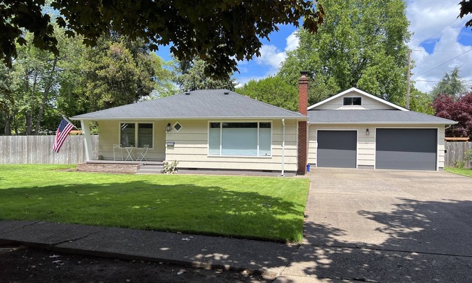 This corner location in a quiet, convenient neighborhood just north of the Willamette River features a sprawling yard and patio, generous off-street parking and walking access to a wide range of shopping (Trader Joe's, Albertsons, Oakway Center Mall, TJ Maxx, diverse restaurants, etc.) — and just a five-minute drive to Autzen Stadium, Cuthbert Amphitheater, Alton Baker Park, Eugene Country Club, and more. The well-appointed, thoughtfully-furnished home offers a large, king bedroom plus a second, queen bedroom with bunk beds.
