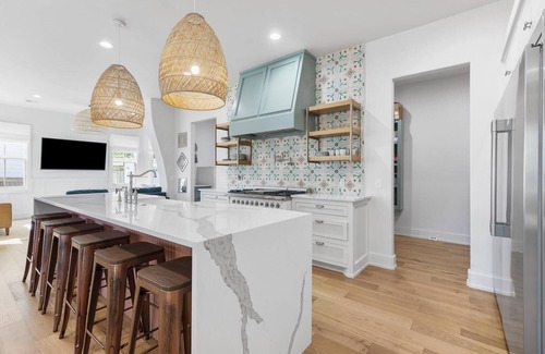 Two King primary suites are on the first floor, each with upscale furnishings, televisions and full ensuite bathrooms. Showers are sizable walk-ins with rainfall shower heads and hand held attachments. Upstairs there are two more King suites with ensuite bathrooms. One has a tiled shower, while the other has a shower/tub combo. Closets include everything you need for settling-in, including box fans and extra pillows. Travel size toiletries are provided for your stay.