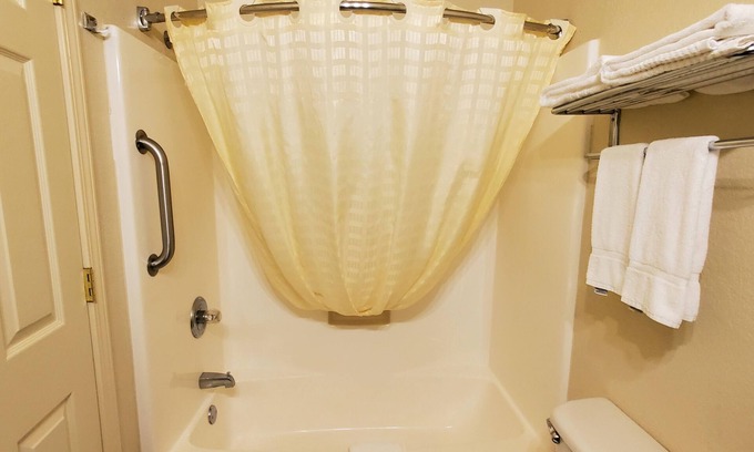 Spacious suite in hotel located conveniently on Hwy 69 near McAlester. The suite features a king size bed, living area with pull our sofa bed, work desk and chair, recliner sofa and a combination of shower and bathtub. For your convenience and entertainment there is 100+ TV channels, free high speed internet, in-room coffee maker, refrigerator and microwave. Relax by our patio area with scenic view overlooking the pond.
