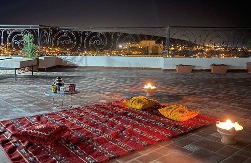 Large roof terrace with incredible panoramic view of the ocean and these waves, the Atlas Mountains and the Aourir Valley.