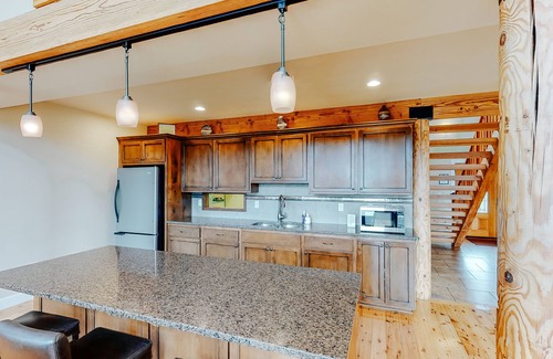 On the first level, you'll come across two bedrooms with a queen bed apiece and two en suite full bathrooms. As you climb up the stairs, you'll reach the main level of this golf-course-front retreat. Vaulted ceilings and floor-to-ceiling windows are the stars of the show that is the open floor plan; the living room, the dining area, and the kitchenette are combined into one big space for everyone's comfort. Admire unparalleled valley and golf course views from the large windows while snuggling on one of the sofas; if it's too cold for your liking, you can turn on the gas fireplace. The wall-mounted flatscreen TV adds fun to the equation. The main fully equipped kitchen is located right behind the kitchenette, separated by a wall. The elegant dining table seats up to eight people and the breakfast bar adds three more spaces. If you'd like to enjoy your meals al fresco, the deck offers an outdoor dining area made up of three tables with chairs. On this level, you'll also find two more bedrooms with a queen bed and a king bed, two en suite bathrooms, and a half-bathroom. The main bedroom features its own fireplace and jetted tub for even more relaxation.