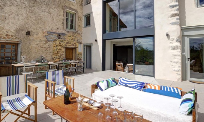 Semi-detached town house: 230m² - 3 levels. On the ground floor, we discover the beautiful living spaces. There is the ultra-equipped kitchen with its central island, the dining room, the relaxation lounge opening onto the terrace, and the TV lounge. On this level, we find the laundry room, the WC and the two entrance halls: one on the street side to access the shops and the other on the garden side. The 1st floor opens onto a relaxation lounge (equipped with an extra bed) with panoramic views. Three bedrooms are tastefully furnished and decorated. The Jules Verne room with 1 bed 140x200 / the Proust room with 1 bed 140x200 and 1 bed 160x190 that can be converted into 2 beds 80 / the Hergé suite with 1 bed 140x200 and 2 beds 90 that can be converted into a bed 180x200, this suite is equipped with a private bathroom (shower & sink). On this level, there is a bathroom (bathtub & double sink) and a toilet. On the top level, we discover the St-Exupéry room with a remarkable view of the surrounding landscapes - 1 bed 160x200. With family or friends, meet at the "Maison du Bonbonnier", a completely renovated town house to offer you a relaxing and exotic stay. Its privileged location allows you to be in the city center as well as in the bucolic Roannaise countryside. This elegant, ultra-spacious & bright family home is carefully furnished & personalized. The warm country feel with contemporary accents offers you a cozy & cocooning stay! You will have an enclosed garden of approximately 1500 m² and a 60m² terrace. For more comfort, charges are included.