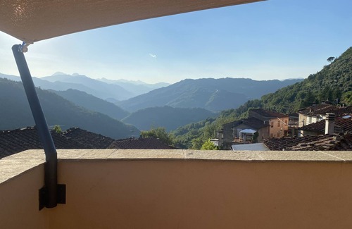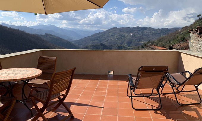 Enter the house through its ancient arched stone doorway to find yourself in the spacious living area with log burning stove and twin windows that give magnificent views over the Apuan Alps. Also on this floor is a large well equipped dining kitchen with seating for eight and a double bedroom with open fireplace and en-suite. Going up the original stone staircase to the large sunny landing you will find a further three bedrooms - two doubles, one of which is en-suite, and a twin, and a large well appointed family bathroom with separate shower. Both double bedrooms have stunning views of the surrounding countryside. The large roof terrace is accessed from the upper floor, and gives incredible panoramic views of the valley and surrounding mountains and village.