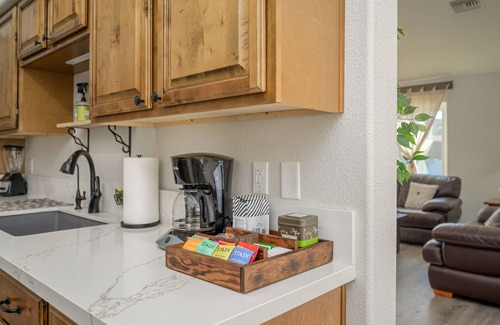 The kitchen is roomy and includes all appliances, a coffee maker, toaster, and ample cabinet and counter space. All cookware, serving dishes, plates, glasses, cutlery, and utensils are included, along with coffee, tea, sugar, cream, and a small variety of seasonings. The house includes a separate laundry room area with a newer front-load HE washer and dryer, along with a small supply of laundry essentials.