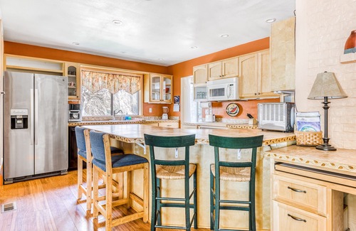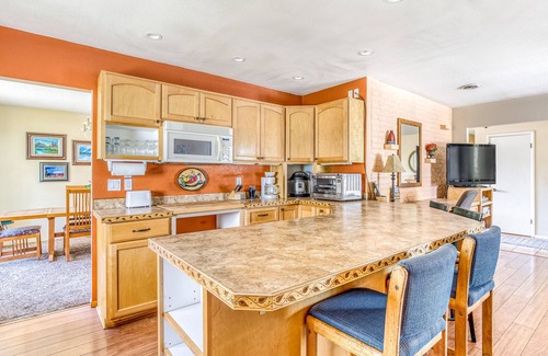 No matter the season, there is plenty of fun to be had at this spacious, two-story home located just 80 miles east of downtown Portland. Guests of all ages will have an absolute blast in the game room/garage containing Ping-Pong, air hockey, a pool table, and foosball, while the ultimate relaxation can be achieved out back in the private, covered hot tub or one on of two large, furnished decks. Back inside, while there is no stove or oven, the well-equipped kitchenette is brimming with appliances and gadgets to help you whip up delicious meals or just reheat yesterday's leftovers. Claim a spot on the large sectional sofa in the living area and stream your favorite shows on the flatscreen TV. Or kick back in the front sitting room - the perfect, quiet spot to dive into one of the provided books. In this room, you'll also find a desk and chair for your laptop if you need take advantage of the high-speed WiFi to do any work or remote schooling while you're away from home.