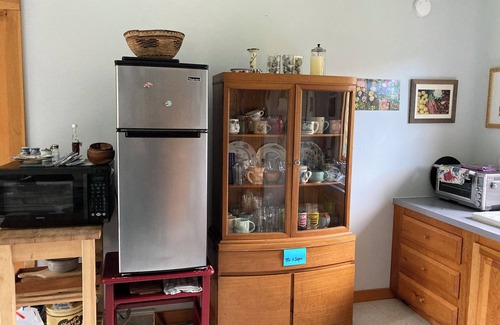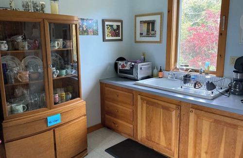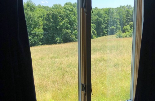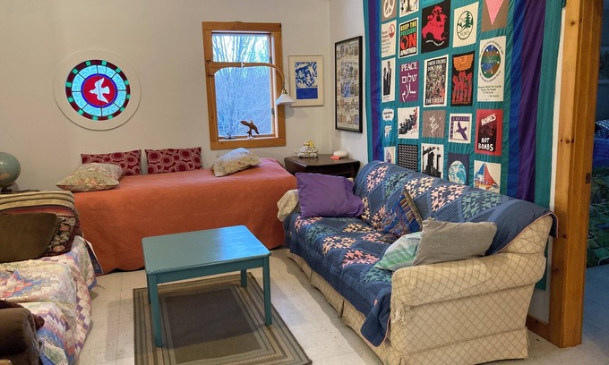 Our barn is in a large field on lot next to our home. Our rental area is upstairs which offers beautiful views of our field and the visiting deer. The eclectic decor is accumulated from years of activism. Our guest room and bathroom are newly renovated. It is a quiet and peaceful area near two state parks. We operate a mail order business in the downstairs area but will not be working while guests are staying with us.