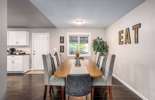 Welcome to our spacious and modern 6 bedroom, 3 bathroom home, perfect for groups of up to 16 guests. Our house features modern updates and a fully furnished kitchen, as well as fun amenities such as a foosball table and two comfortable living areas. The outdoor area includes a large fenced in yard for entertaining. Our house is conveniently located near I-90 and the Spokane Valley Mall, making it the perfect retreat for families and groups.