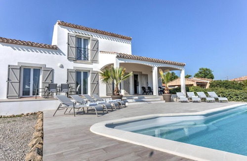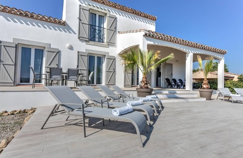 This modern villa is all ready for your ultimate stay in the sunny south of France. With four bedrooms, all with ensuite bathrooms, you will enjoy pure luxury here. Each room has air conditioning, so it always stays nice and cool. The private pool is heatable (on request), and on the spacious terrace you can relax in peace and enjoy total privacy. This is how you celebrate holidays!
