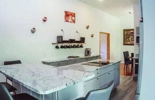 Kitchen/Dining room - 8 person rustic dining table plus a 4 person island bar, full-size refrigerator, stove, microwave, dishwasher, Keurig, drip coffee maker, crock pot, and toaster. Plenty of pots and pans, dishes, and utensils are also available as well as several spices used for cooking.