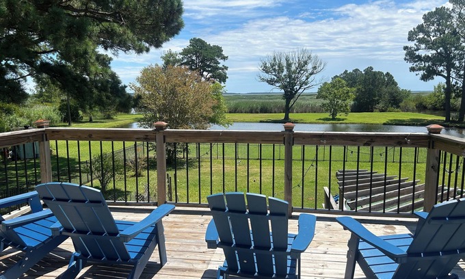 The Sportsman’s Lodge is a rustic and relaxing modern getaway with all the conveniences you are accustomed to but surrounded by the gorgeous Back Bay Wildlife Refuge. Enjoy the relaxing countryside at this waterfront property, while still being only a short drive away from Sand Bridge Beach. Sit back in our jetted bathtub and watch as deer eat under the pear trees right outside. Get a workout in at our gym or watch the sunrise on our deck overlooking the Back Bay Wildlife Refuge. Spend the night watching fireflies or get out and about at one of the many local restaurants offering some of the best seafood you will ever have! If you are looking to get away from the standard Virginia Beach Boardwalk tourist experience and get back to nature, this is the place for you.