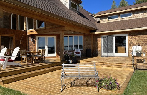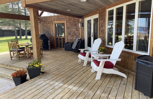 Whether you're savoring your morning coffee on the sprawling open deck, basking in the warmth of the sun, or stargazing under the vast night sky, the outdoor spaces at Brulee Point Lodge promise endless moments of serenity and joy. Retreat to the covered screen porch, complete with a wood-burning fireplace, for intimate gatherings and fireside tales. The large open front lawn is perfect for volleyball/badminton - all setup and ready for fun! There is also a 300 sq. ft. screened-in pavilion down by the water, which is another nice gathering space.