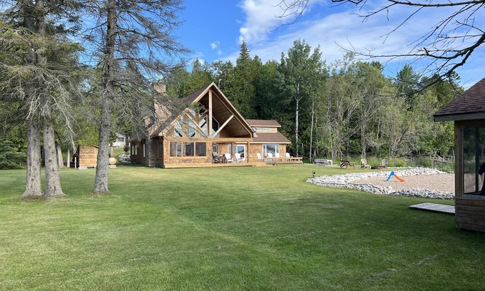 Welcome to Brulee Point Lodge, an inviting retreat nestled amidst the lush foliage of Michigan's breathtaking Upper Peninsula. Situated along 100 feet of pristine Lake Huron shoreline at the gateway to the Les Cheneaux Island chain, this expansive 3300 square foot home is ready for unforgettable family gatherings.