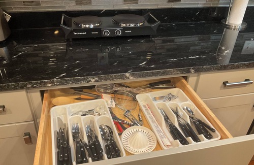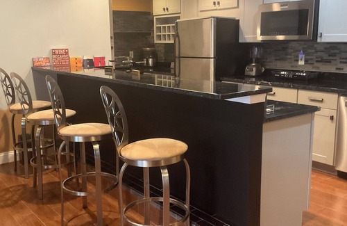 This beautifully spacious lower level apartment offers over 1,700 square feet of living space, providing comfort and convenience. Recently upgraded kitchen, bathroom, laundry room with combo washer/dryer and plenty of folding and shelf space. This rental has two well-appointed bedrooms designed to meet all your needs. The first bedroom boasts a king-sized bed, a regular closet, two nightstands, a dresser, and cable TV, creating a relaxing retreat. The second bedroom includes a double-sized (full) bed, a custom closet, two nightstands, a dresser, and a TV, perfect for guests or roommates. Also two airbeds available (King/Queen). The bathroom in the common area features an upgraded glass barn-door Spa and Rain Shower and single vanity. Towels included.