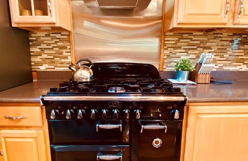 ✔️ Full kitchen with stove, oven, refrigerator, microwave, coffee maker, and cookware