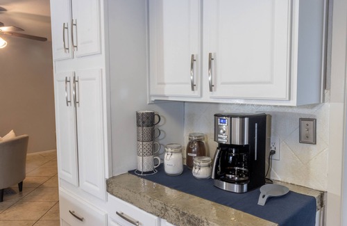 The kitchen is fully stocked with everything you need, from cooking essentials to a fully loaded coffee bar.