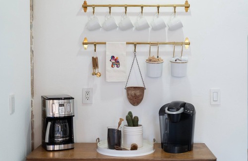 ☀︎Kitchenette w/ fridge, toaster oven, microwave, coffee + tea