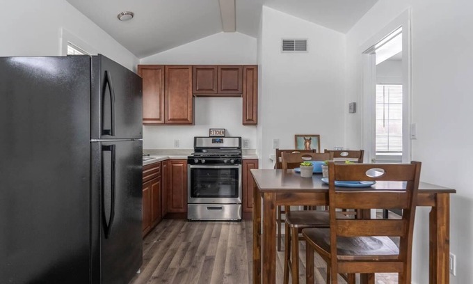 The kitchen has plenty of room for cooking and is fully-equipped with a sink, stove, oven refrigerator, microwave, coffee maker and toaster. Dishes, pots and pans, cutlery, and utensils are also provided. Towels, washcloths, soap, and shampoo are included in your stay.