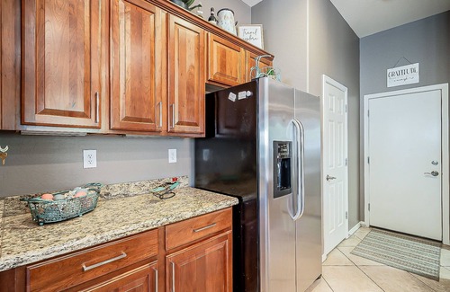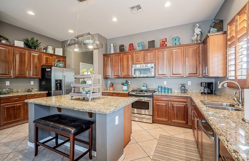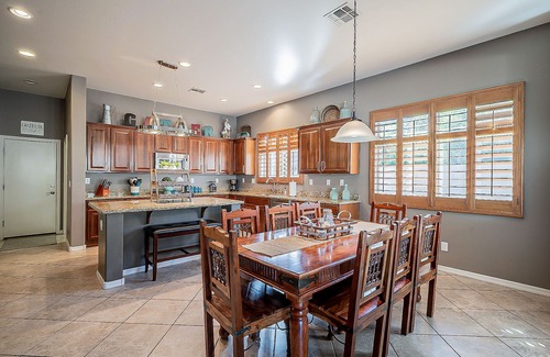 The kitchen lies off of the game room and is fully equipped with coffee maker, coffee grinder, toaster, and a blender for mixing up your morning smoothie or a batch of margaritas to enjoy poolside. The kitchen includes a large double door refrigerator and freezer, 4 burner gas range, oven and broiler, microwave and dishwasher. Prepare your favorite meals using prep space on the large island including granite counter tops throughout the kitchen. Dinnerware, silverware and glasses provide place settings for up to 8 guests. All the cookware, bakeware, and utensils you would have in your own kitchen can be found in your home away from home. Sit down to your delicious meal in the open dining area off the kitchen including a dining table and 8 chairs. A cabinet buffet is in the dining room, inside it you will find placemats for the dining table and board games for friendly competition after dinner.