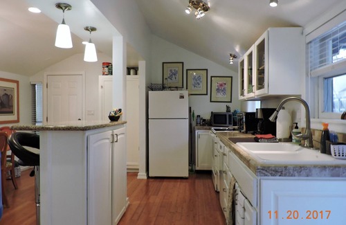 The kitchen is fully stocked with utensils, dishes, glasses, pots & pans. There are bamboo floors for easy cleanup & travertine countertops, along with a granite-topped bar. 2 pantries have lots of room, plus cleaning supplies & brochures about Prescott. A lazy Susan corner cabinet will hold your food or seasonings. We provide salt, pepper, coffee, teas, hot chocolate, sugar, cream, olive oil & coconut oil, plus a few other items.