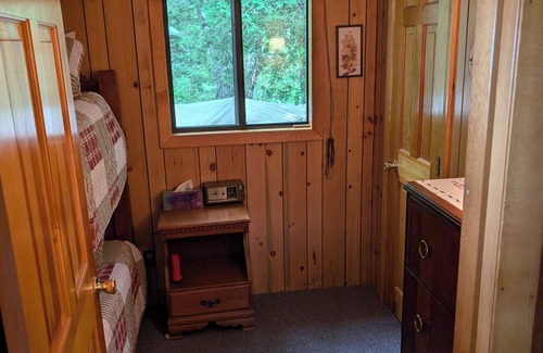 The bedroom has a comfortable double bed with a large picture window looking out over the cove, dresser, rustic night stands and an alarm clock. The second bedroom has a bunk bed, night stand, dresser, and a window looking out towards the woods behind the cottage. There is a sofa in the main living room that can sleep 1 more person. Both bedrooms have a dresser, oscillating fan, nightstand(s) with lamp(s), a closet, comforters and extra blankets to stay cozy on cool nights. All pillow covers, and mattress covers are new for your comfort. The bathroom has another window facing the woods, the usual sink and toilet, a 3'X4' roomy shower with heated exhaust fan, and a storage closet. The cottage has a full-sized electric water heater to ensure plenty of hot water. The cottage interior is over 700 square feet in size with plenty of space as you can see from the pictures. Four Adirondack chairs (cushions provided), a small table, and grill await you on the wrap-around deck facing the lake just outside the sliding glass doors.