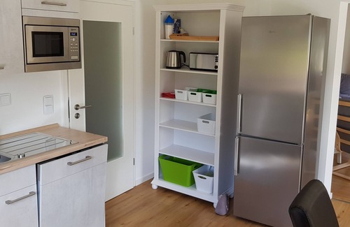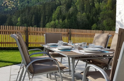 This three bedroom vacation rental is situated right at the edge of Graswang with undisturbed views of the stunning nature surrounding it. The kitchen and dining area opens to the Southwest facing patio and garden with ample seating space and great views.