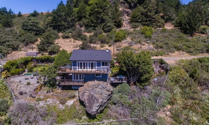 Come visit this luxuriously appointed home located on the Sonoma Coast and Sonoma's award winning Wine Country. The home is built into a massive rock high above a year-round creek that feeds to the Russian River and the Pacific Ocean. This home is drenched in sunlight and has beautiful gardens throughout creating a private oasis with 2 outdoor fireplaces enjoyed year round. We have views of the Russian River estuary, where we often kayak and paddle board. We have an outdoor private hot-tub with an outdoor shower that over looks the creek. The home abuts the Jenner Headlands preserve where there are miles of hiking from our front door. 3 minute walk to the local Wine Bar, Cafe Aquatica and the kayak/paddle launch. Our gardens our beautiful year around. And our neighborhood is a birders dream. You are going to love your stay!