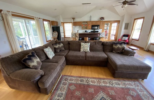 2nd Floor/ Mid Level: Front stairway leading to main entrance door on furnished sound view covered deck. Opens into living room sitting area that has 2 sofas, desk, chair with built in book case and cabinet, CF, coat closet. 1- Queen Bed Master Bedroom, TV, CF. 2-Jack and Jill Bedrooms- 1-bedroom has 1 Queen Bed, TV, CF 1-Bedroom has 1 Bunk bed, CF that share 1 full size bathroom with a breezeway sun room study accessing backyard door to deck with stairs also front yard sliding glass door to furnished sound view front deck. 1-very large Queen PRIMARY Bedroom (over 500sq.ft) with 1 Bunk Bed, TV, CF a sofa & rocking chair includes own private backyard furnished deck also built in bench seating & stairs leading to top level screened porch with table and chairs off the Great Room.