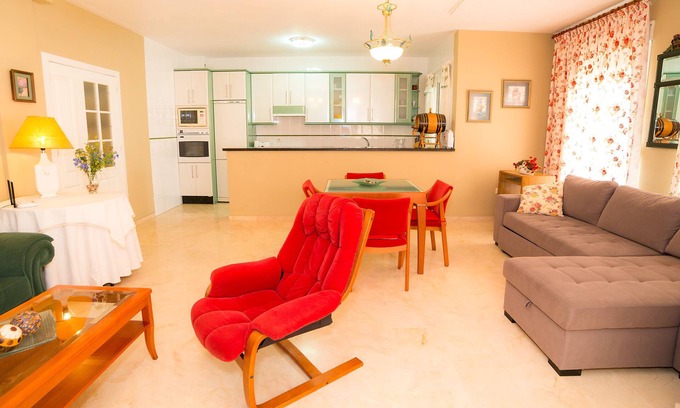 Spacious and bright apartment with two rooms and 106 m2 with living room of 42 m2 for 4/6 people located in La Herradura, Almuñecar. Located in a quiet area, without noise and 60 meters from the beach, perfect to enjoy a few days in a very special area of the tropical coast of Granada, characterized by its unique beaches and places and its gastronomic offer in nearby restaurants and beach bars and activities such as diving, windsurfing, paragliding, cycling ....